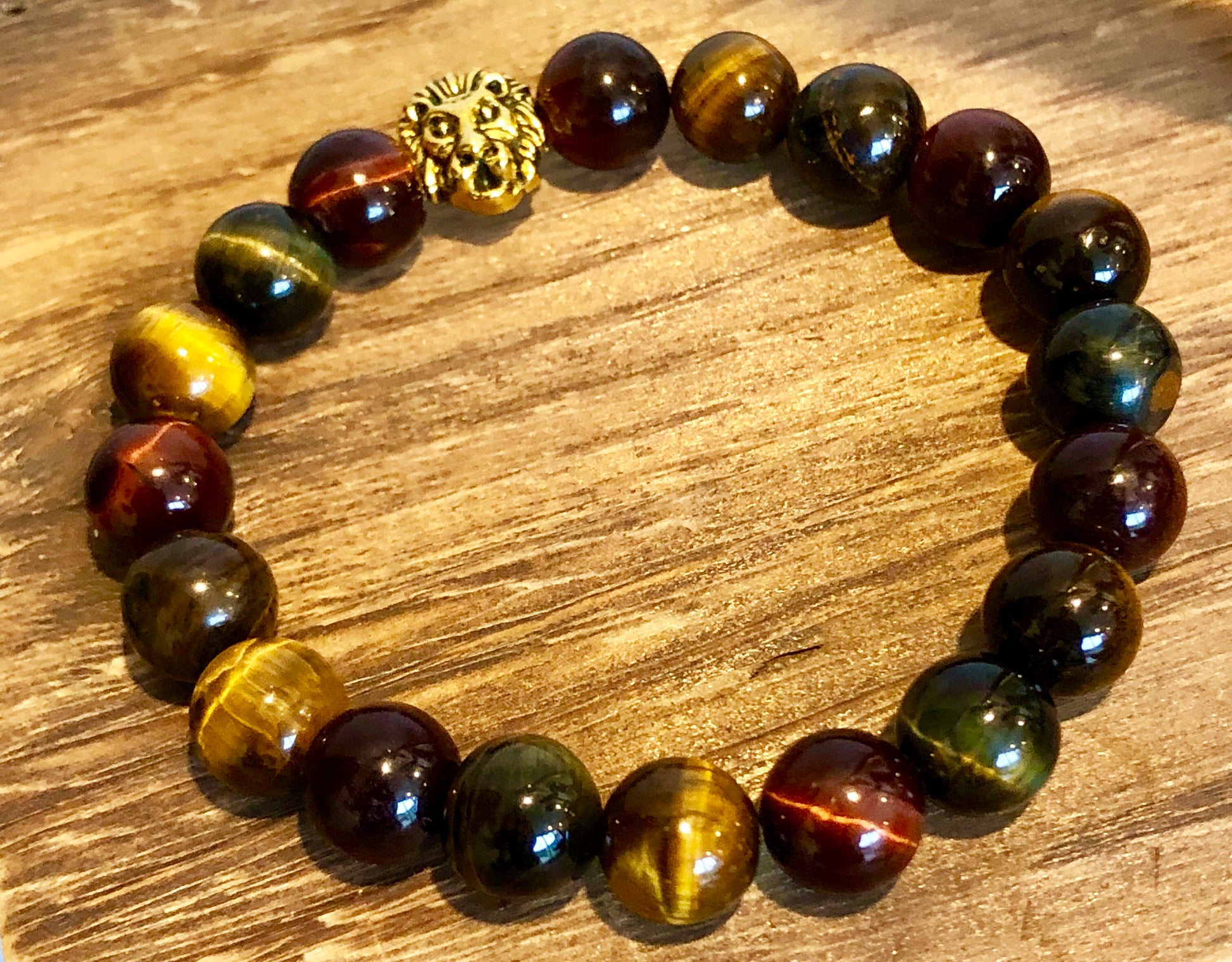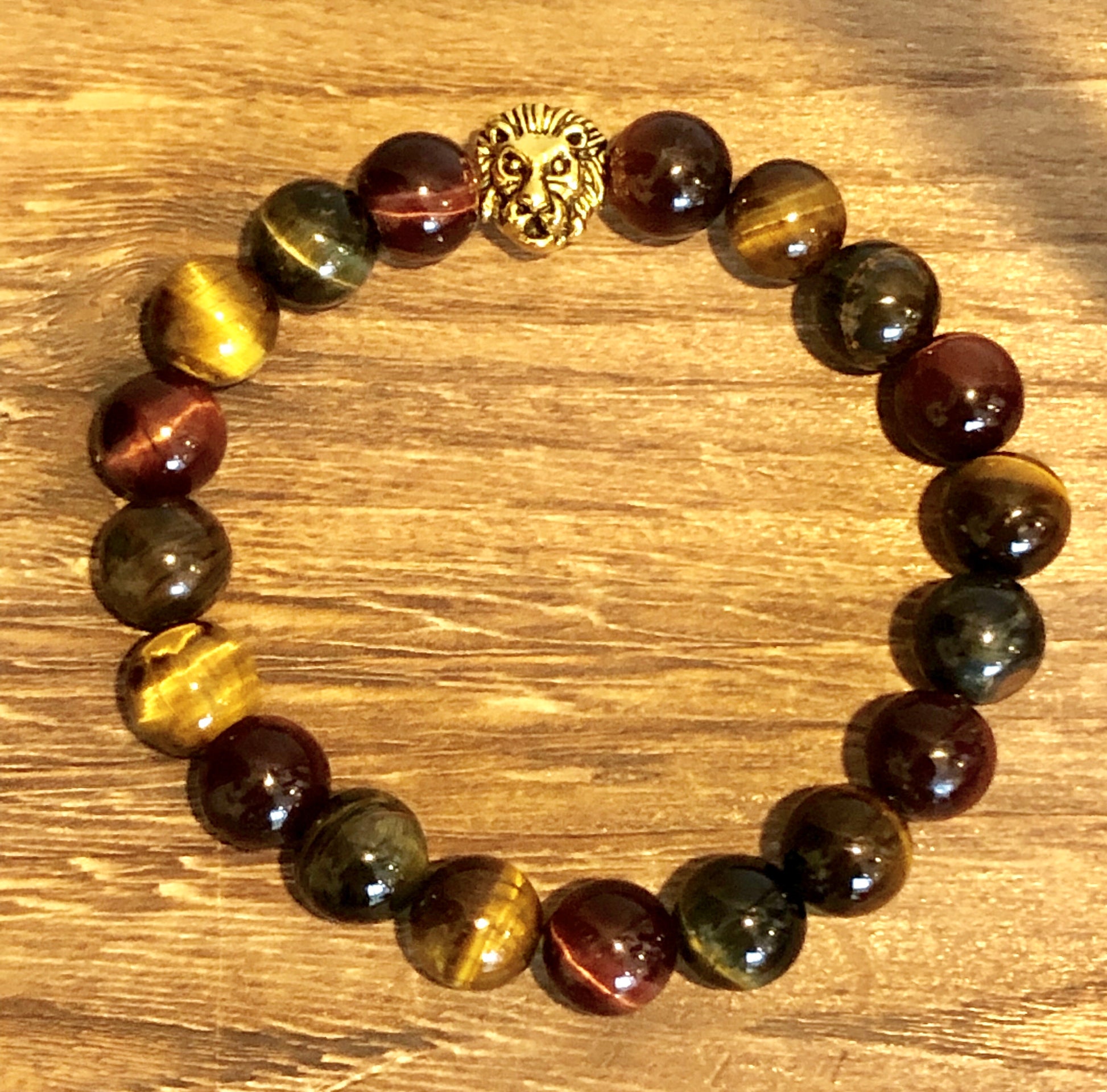10mm Multicolored (red, yellow, green) Tiger Eye Stones accented with a Gold Colored Metal Centerpiece (7 inch)