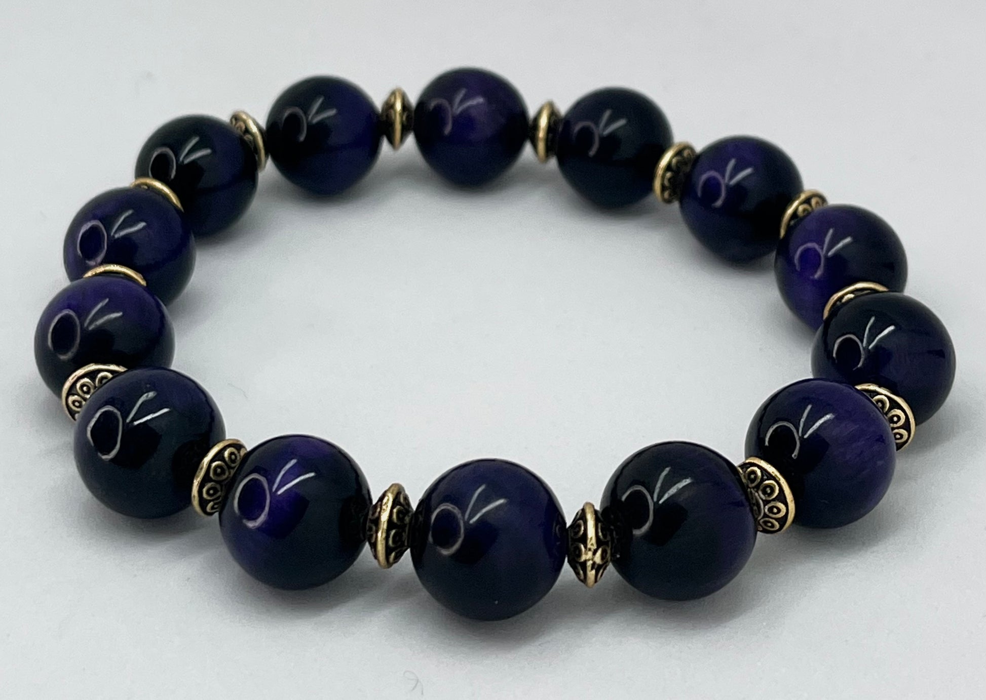 12mm Blue Tiger Eye stones accented with brass pieces.